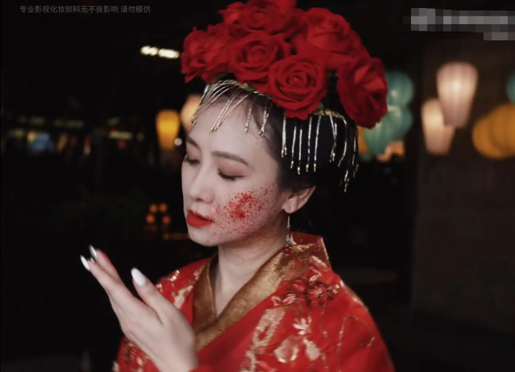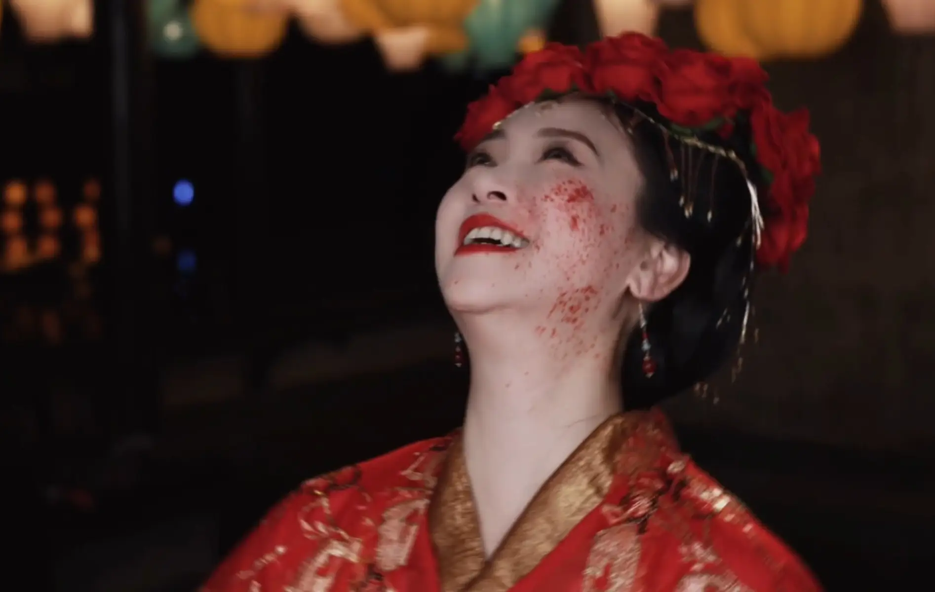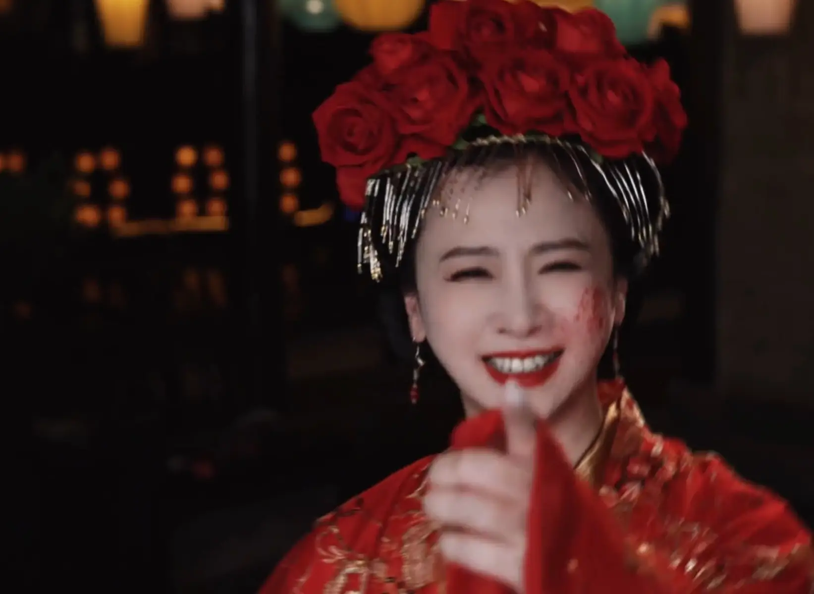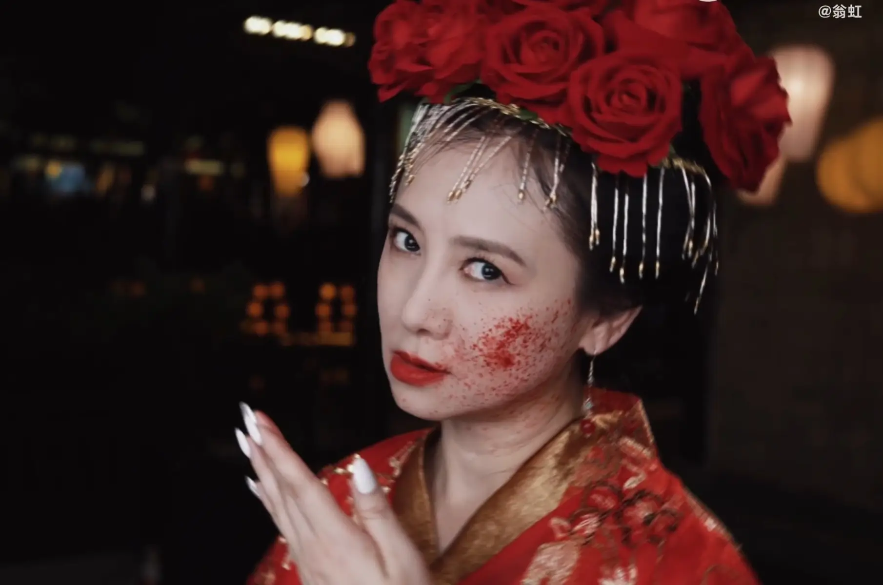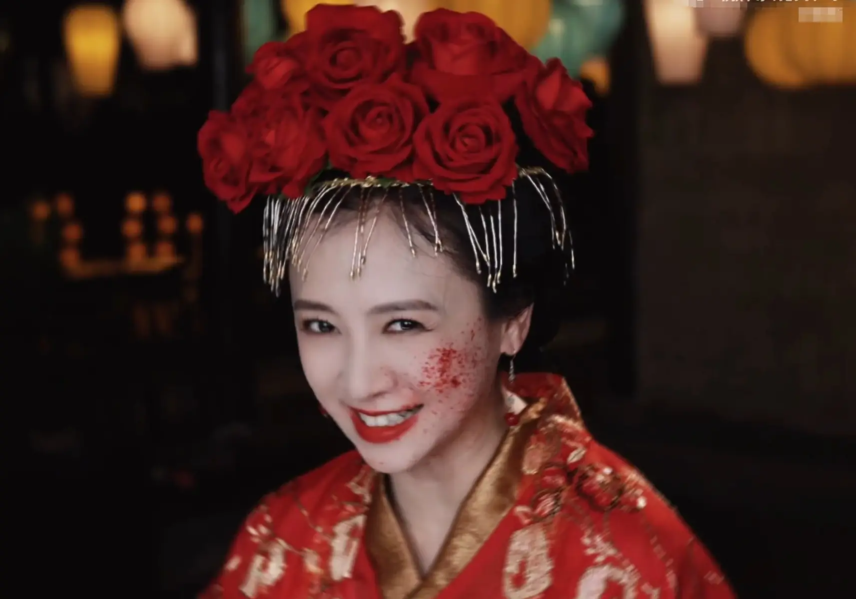 翁虹開(kāi)懷大笑,搭配臉上的血跡,笑容邪魅,有種鬼新娘的感覺(jué)。