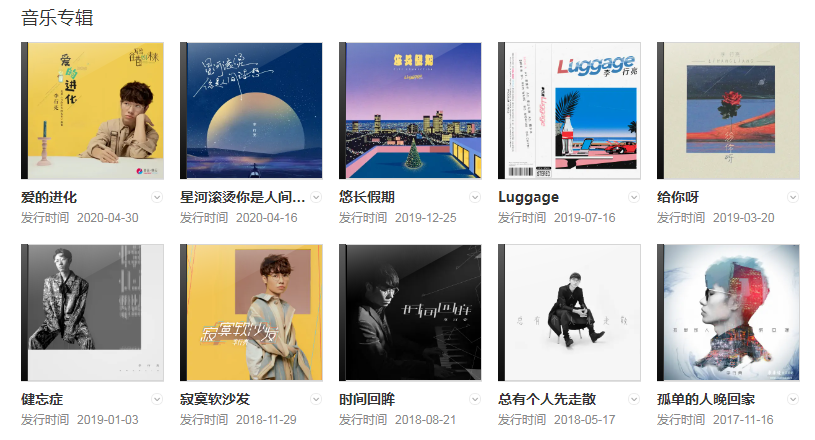 2020年,0203日發(fā)行歌曲《天使的背影》;同年發(fā)行網(wǎng)劇《醫(yī)妃難囚3》片尾曲《洛緣訣》;同年發(fā)行歌曲《江城》;416日發(fā)行歌曲《星河滾燙你是人間理想》;同年430日發(fā)行歌曲《愛(ài)的進(jìn)化》;同年0709日發(fā)行歌曲《愛(ài)不到的你》;同年1012日發(fā)行歌曲《路人而已》。
