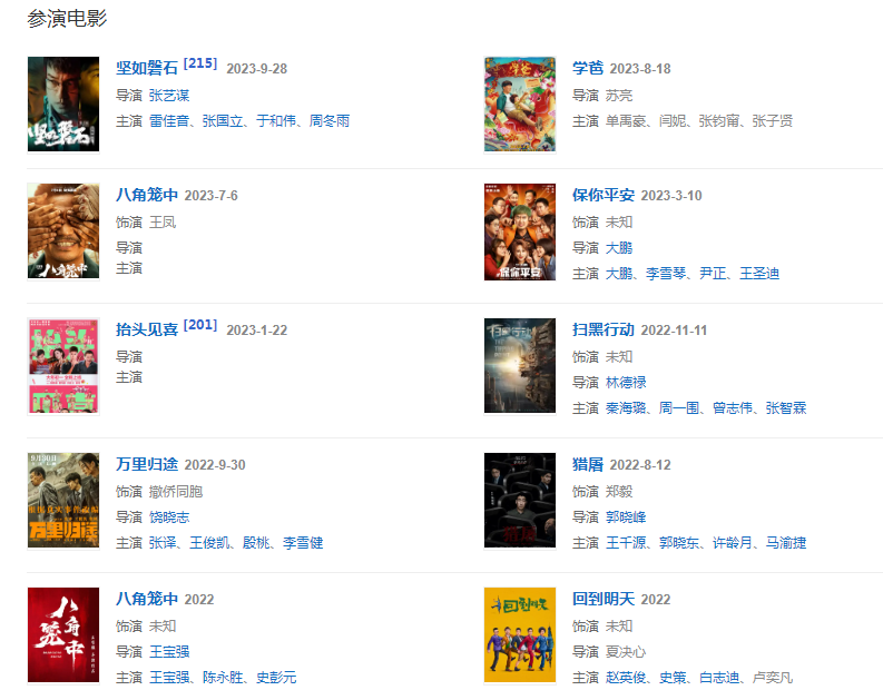 代表作品:瘋狂的石頭、殺生、民兵葛二蛋、我的團(tuán)長(zhǎng)我的團(tuán)、喜羊羊與灰太狼之我愛(ài)灰太狼、港囧
