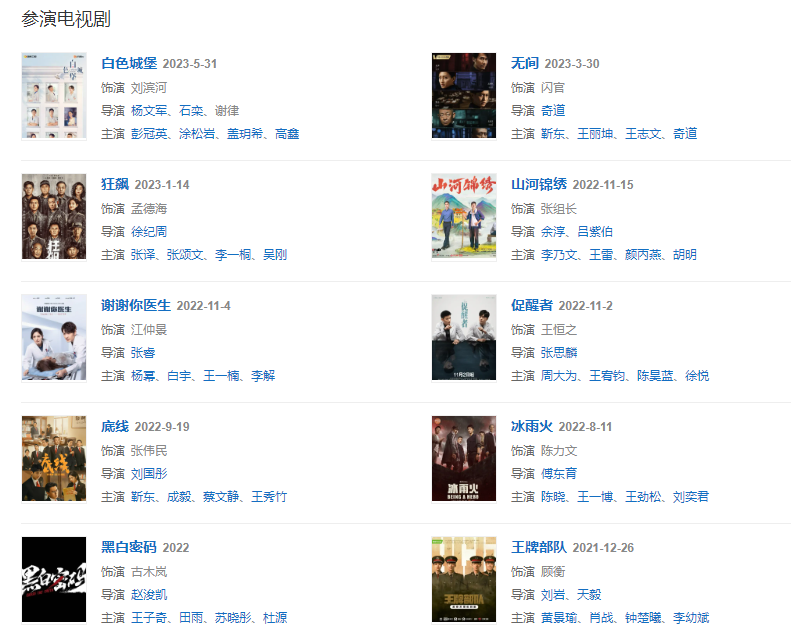 代表作品:人間正道是滄桑、毒刺、國門英雄、桐柏英雄、人民的名義、大清鹽商等