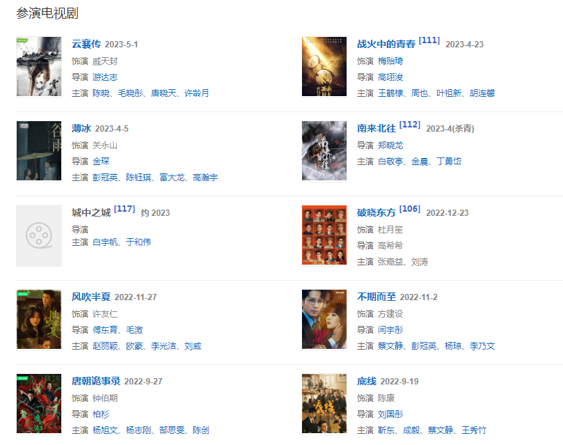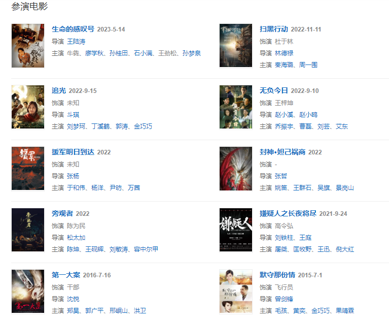 代表作品:大明王朝1566、北平無戰(zhàn)事、瑯琊榜、麻雀、大軍師司馬懿之軍師聯(lián)盟、破冰行動、冰雨火、獵毒人