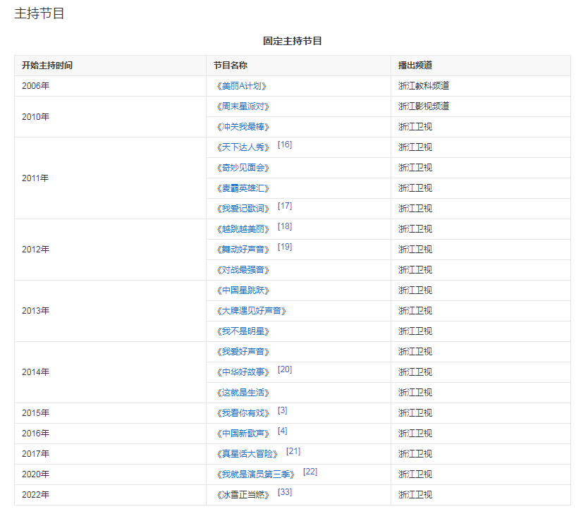 2016年,出任浙江衛(wèi)視勵志音樂評論節(jié)目《中國新歌聲》主持人。2017年,以補位嘉賓加盟 [12] 《花漾夢工廠》第二季。