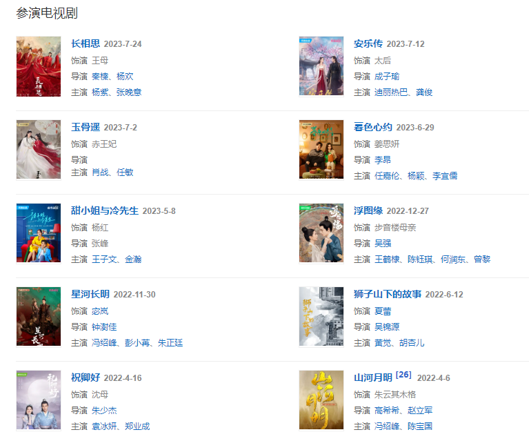 2014年在電視劇《活色生香》中飾演文夫人。2016年參演《誅仙》改編的古裝神話劇《青云志》。