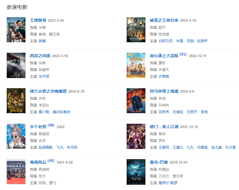 2021年9月28日,在播出的電影《毒海風(fēng)云》里飾演曾淑嫻;12月15日,主演的電影《唐門:美人江湖》在愛奇藝播映。 12月4日,由童飛出演的電影《半個(gè)老爸》在湖北武漢正式開機(jī)。