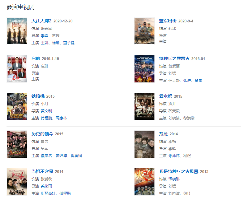 2020年9月4日,在現(xiàn)代軍事軍旅劇《藍(lán)軍出擊》中飾演韓冰;12月20日,參演的電視劇《大江大河2》播出,在劇中飾演隋春鳳。