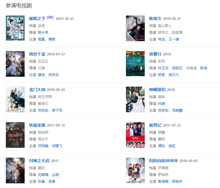 代表作品:后宮、女媧傳說之靈珠、單親媽媽、天天有喜2、陳情令、深宮諜影、唐宮燕