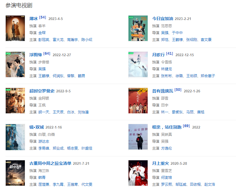 代表作品:錦繡未央、倚天屠龍記、兩世歡、月上重火、鏡·雙城