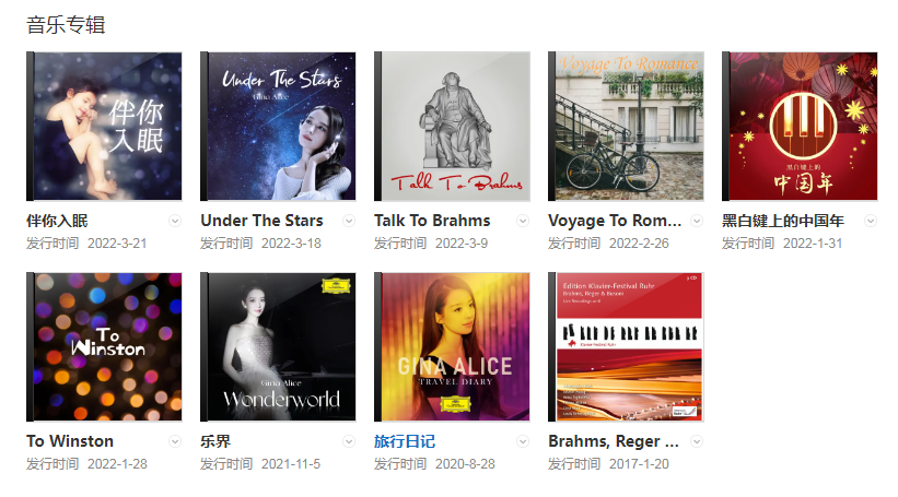 2022年5月20日,吉娜·愛麗絲的首張個(gè)人獨(dú)奏專輯《Wonderworld》(樂界)在北美上市。吉娜的丈夫郎朗擔(dān)任這張專輯的制作人。
