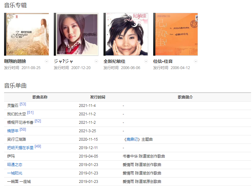 2006年,推出首張個人EP專輯《佳信·佳音》;同年,推出首張個人音樂專輯《全新紀(jì)敏佳》;隨后,出演個人首部電影《成都之戀》。