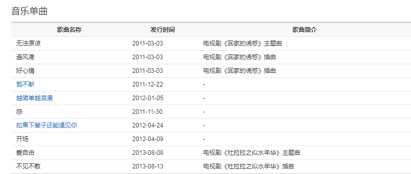 2013年,為電視劇《杜拉拉之似水年華》演唱主題曲及插曲 。