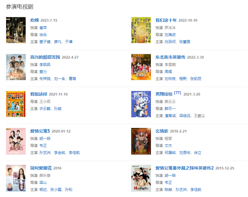 代表作品:愛情公寓、愛情自有天意、愛情悠悠藥草香、鹿鼎記、你是我的姐妹、周日戀曲、LOURA