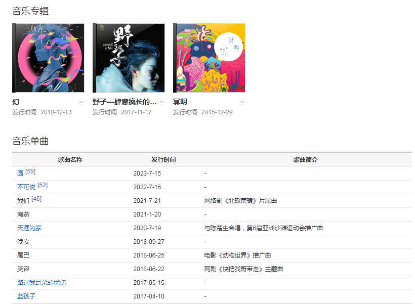 2017年,推出個(gè)人翻唱單曲《路過(guò)我耳朵的憂(yōu)傷》 ;同年,她還為動(dòng)畫(huà)電影《藍(lán)精靈:尋找神秘村》演唱了中國(guó)區(qū)推廣曲《藍(lán)孩子》 。