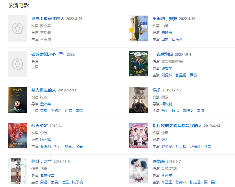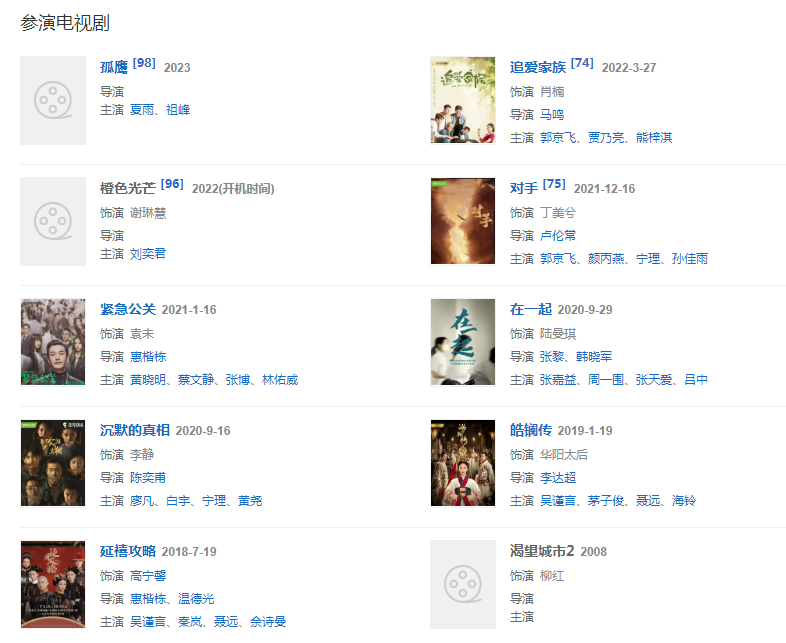 代表作品:延禧攻略、皓鑭傳、春風(fēng)沉醉的夜晚、我不是藥神、HELLO!樹(shù)先生、暴裂無(wú)聲、追兇者也