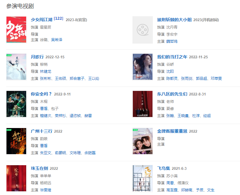 代表作品:閃光少女、甄嬛傳、海上牧云記、高興遇見你、天衣無縫、長安十二時(shí)辰、愛上北斗星男友、良辰美景好時(shí)光、若你安好便是晴天、風(fēng)聲