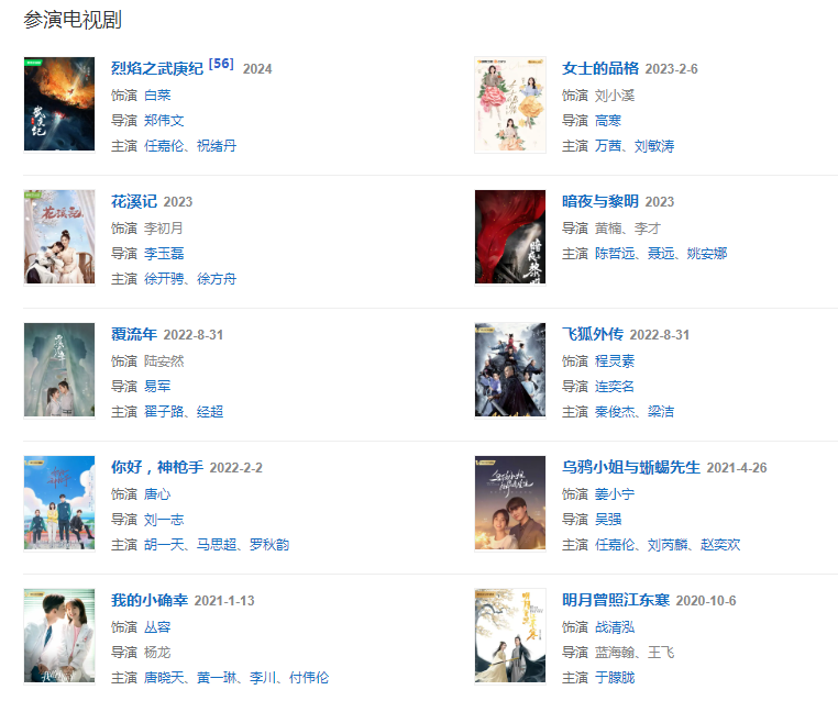 2020年1月,主演由楊龍執(zhí)導(dǎo)的《我的小確幸》播出 ;同年10月6日,領(lǐng)銜主演由藍(lán)海翰、王飛執(zhí)導(dǎo)的古裝武俠言情劇《明月曾照江東寒》。