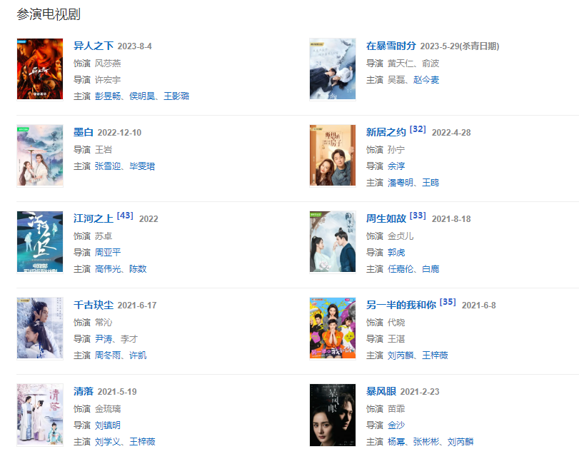 2021223日,與楊冪、張彬彬等合作出演的都市反諜劇《暴風(fēng)眼》播出 ;