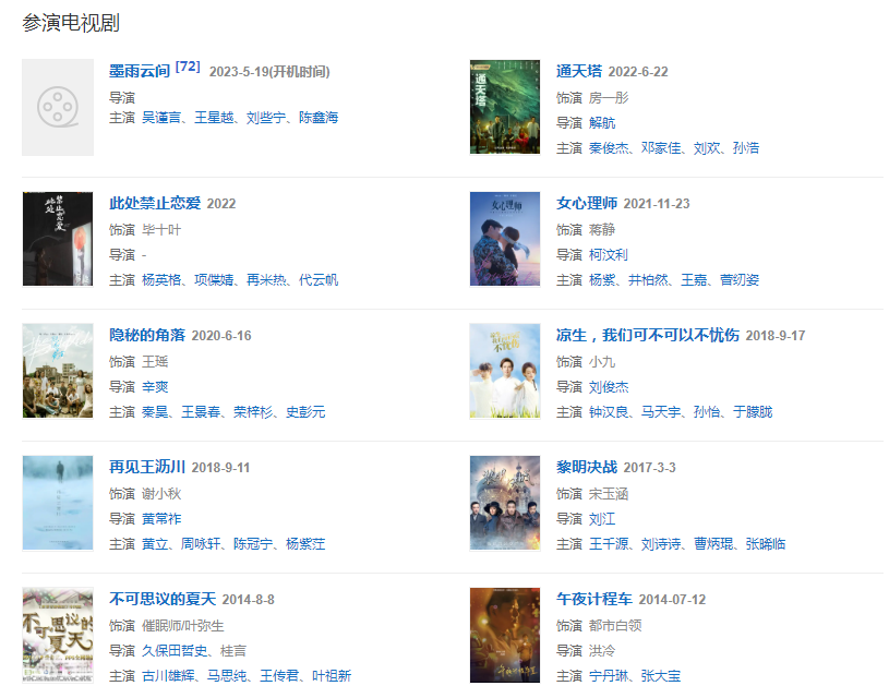 2015年起,相繼拍攝警匪片《解救吾先生》;同年,拍攝青春片《致青春·原來你還在這里》、《萬物生長》、《夏天19歲的肖像》中塑造了多個(gè)性格迥異的少女形象,靈氣十足、個(gè)性執(zhí)著也成為其突出的銀幕標(biāo)簽。 。