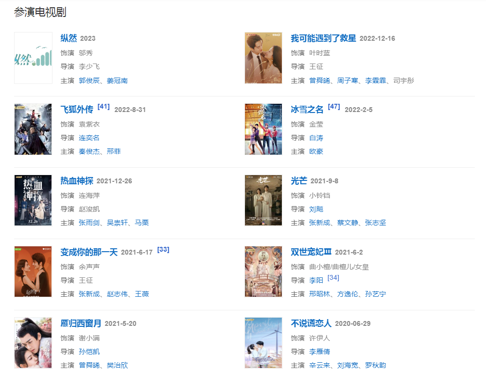 2023年1月20日,參加《東西南北賀新春》;1月22日,參加《“百花迎春”——中國文學(xué)藝術(shù)界2023春節(jié)大聯(lián)歡》,演唱歌曲《中華全家?!?;5月10日,主演的奇幻愛情劇《縱然》開機(jī)。