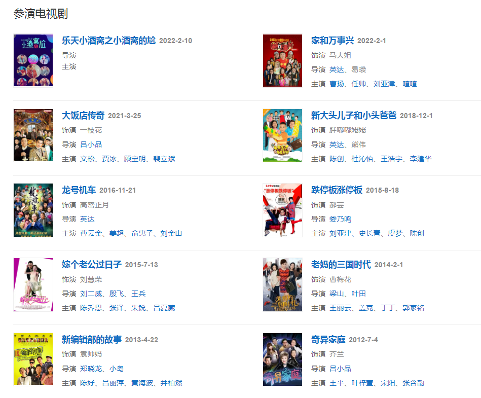 代表作品:海霞、閑人馬大姐、老媽的三國時代、馬大姐外傳、夢幻家園、機器人趣話、黃土坡、想跳就跳