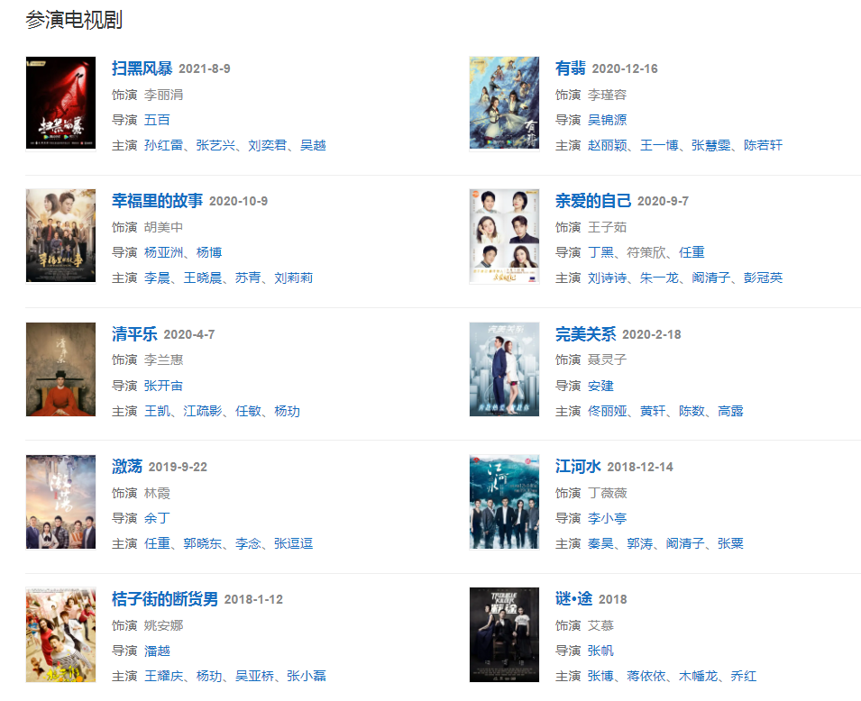 2021年8月9日,出演當代涉案劇《掃黑風暴》播出,在劇中飾演馬帥的妻子李麗涓。