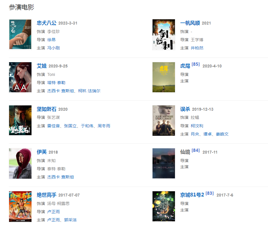 2020年,與王迅友情出演了張藝謀執(zhí)導的電影《堅如磐石》。