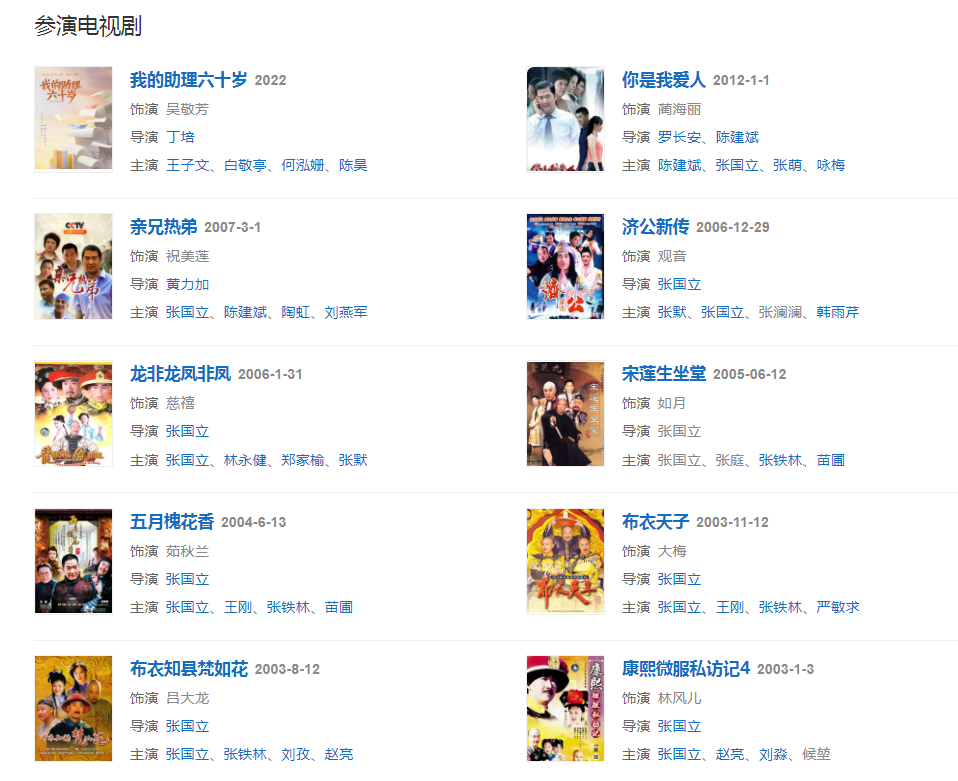 2006年在《親兄熱弟》飾祝美蓮,合作演員有張國立、陳建斌、陶虹。