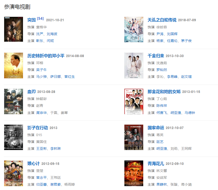 代表作品:手心手背、牽手、為奴隸的母親、那金花和她的女婿、麻辣婆媳、歷史轉折中的鄧小平、攀登者