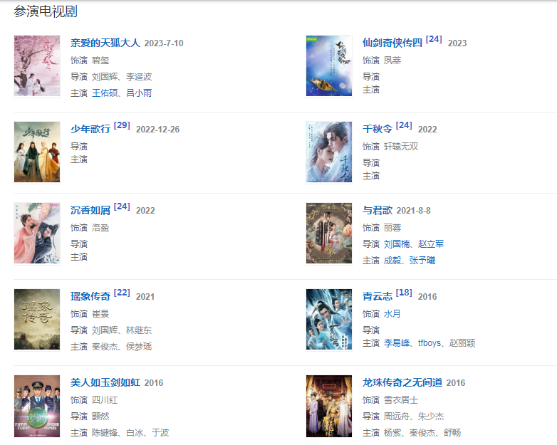 代表作品:《誅仙》《陸貞傳奇》《封神英雄榜》《帶刀女捕快》《新洛神》《黑玫瑰》、《好想聽你再說愛我》