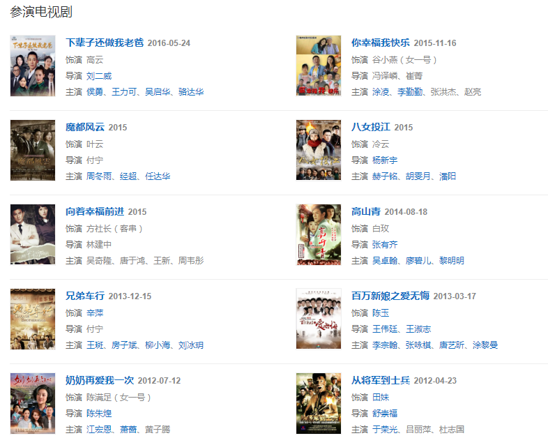 2011年主演抗日戰(zhàn)爭劇《水上游擊隊》;同年主演都市情感劇《漂亮主婦》。