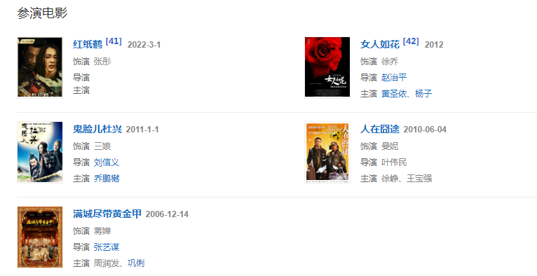 2006年,出演張藝謀執(zhí)導(dǎo)的古裝片《滿城盡帶黃金甲》,憑借該片提名金雞百花電影節(jié)最佳新人獎(jiǎng),獲得“賀歲十年歡樂盛典”最受歡迎電影女配角獎(jiǎng)。