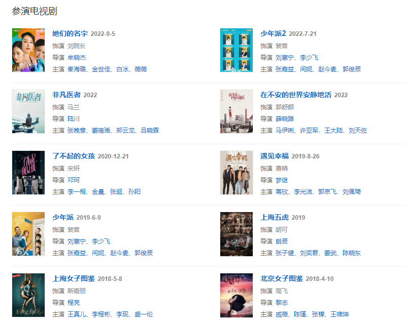 代表作品:少年派、遇見幸福、上海女子圖鑒、曼谷雨季、白領(lǐng)公寓