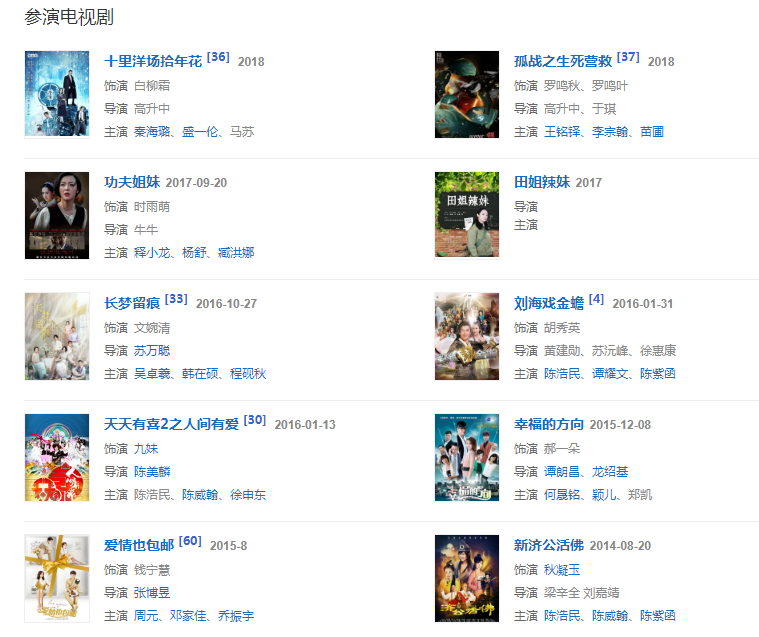 代表作品:七種武器之孔雀翎、楚留香傳奇、天天有喜、天天有喜2之人間有愛、劉海戲金蟾、活佛濟公:第二部、血色櫻花、步步驚心、薛平貴與王寶釧、深宮諜影