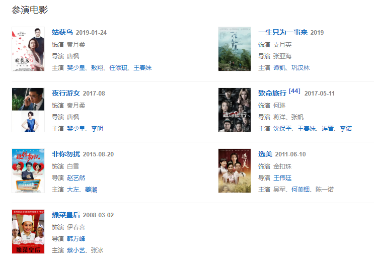 2007年,因出演古裝武俠劇《楚留香傳奇》中柳無眉一角而走入大眾的視線。
