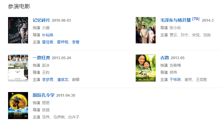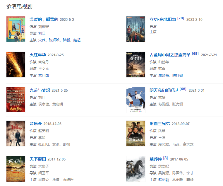 代表作品:金粉世家、京華煙云、老大的幸福、火線三兄弟、大連故事、風雨、楚喬傳 、