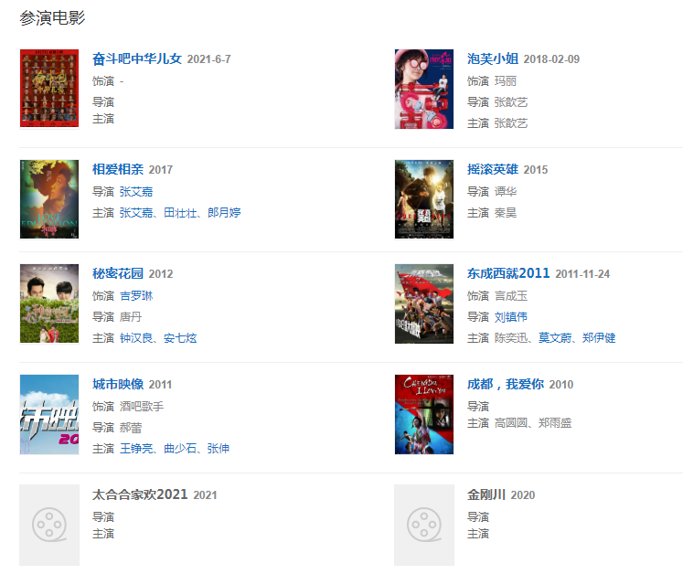 代表作品:譚某某、如果有來生、英雄贊歌、緣分一道橋、給你一點顏色、愛到底、影、攀登者、江湖兒女、如你所愿、昨天涯——獻給布宜諾斯艾利斯、3811