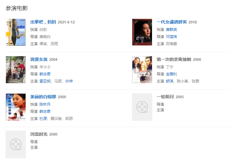 代表作品:正陽門下小女人、一代女魂唐群英、浪漫女孩、美麗的白銀那、雷雨、黑冰、女人不哭、金枝玉葉