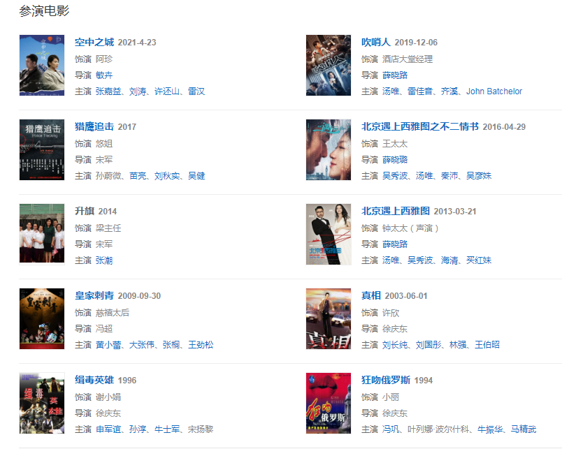 1997年,參演電影《緝毒英雄》,獲得大眾電影百花獎最佳女配角提名。