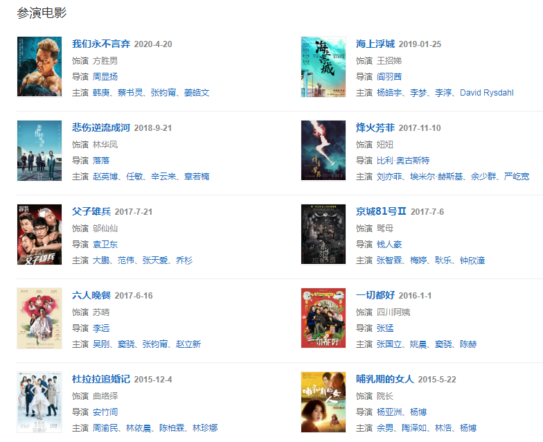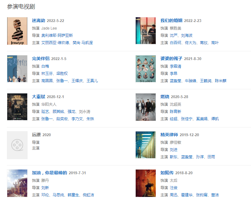 代表作品:蝸居、枕邊書、末代皇帝、宋家皇朝、玫瑰漩渦、辣媽正傳、六人晚餐、上海紅美麗、如懿傳、加油,你是最棒的、精英律師、建國(guó)大業(yè)