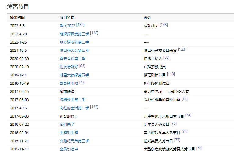2015年,參加明星生活體驗(yàn)秀節(jié)目《偶像來(lái)了》;同年,她還主持了兩季偽音樂(lè)類純網(wǎng)絡(luò)綜藝節(jié)目《偶滴歌神啊》。