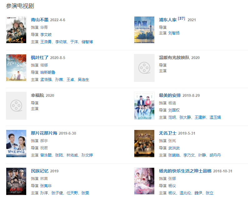 2020年,領(lǐng)銜主演電視連續(xù)劇《不負(fù)人民》。2022年4月6日,搭檔王洛勇、李幼斌領(lǐng)銜主演的大型現(xiàn)代林業(yè)建設(shè)題材電視劇《青山不墨》在央視一套播出 。