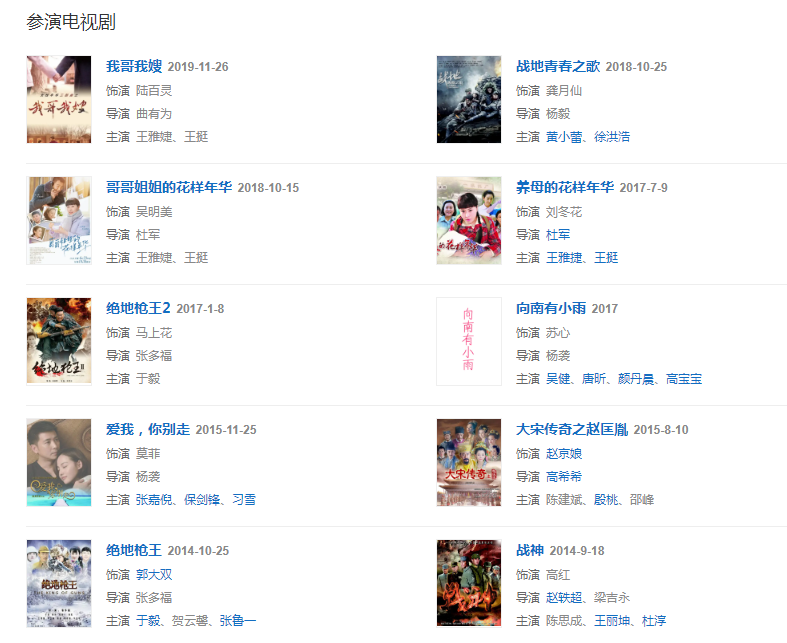 2017年,出演楊襲執(zhí)導(dǎo)的現(xiàn)代劇《向南有小雨》。2019年,出演都市情感劇《哥哥姐姐的花樣年華》 。