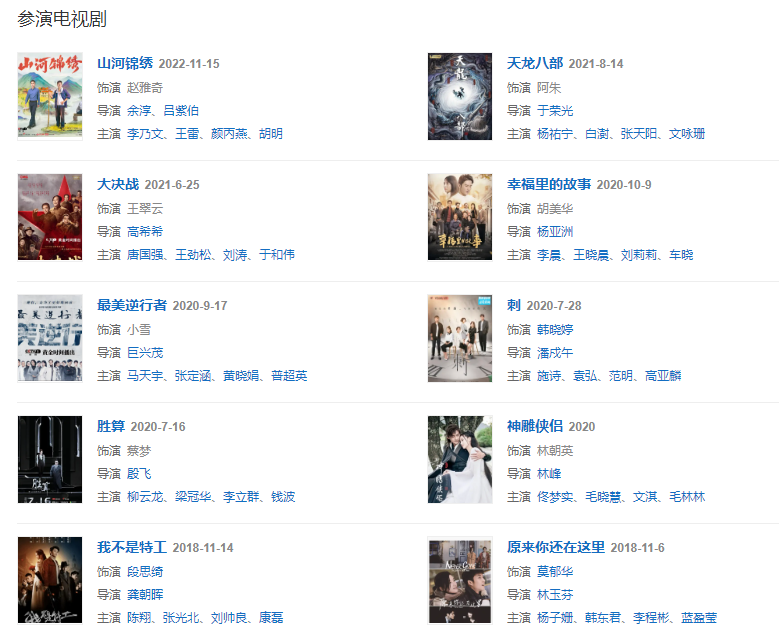 代表作品:延禧攻略、美人心計、勝算、刺、特勤精英、那些年,我們正年輕、不如冒險、幸福里的春天、大決戰(zhàn)