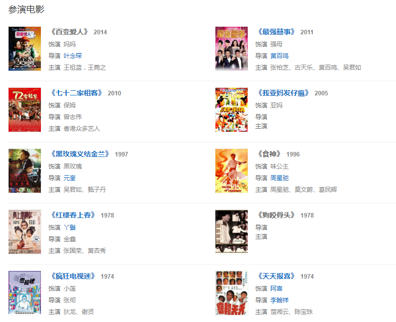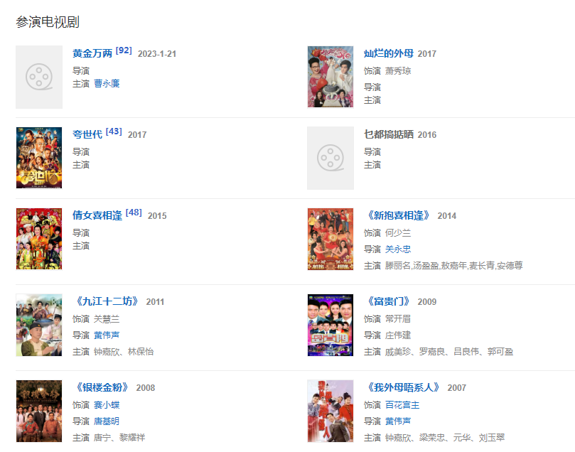 代表作品:《真情》《富貴門》《皆大歡喜》《非常岳母》《飛女正傳》、七兒八女九狀元