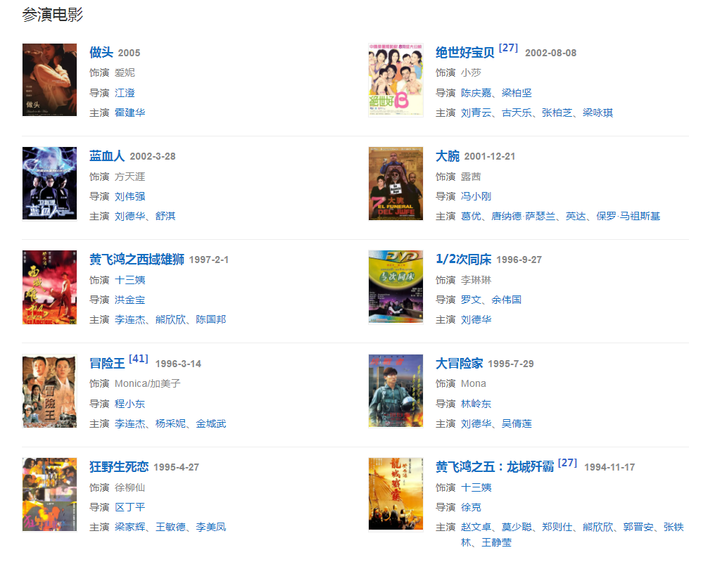 代表作品:黃飛鴻之一壯志凌云、黃飛鴻之二男兒當(dāng)自強(qiáng)、黃飛鴻之三:獅王爭霸、笑傲江湖Ⅱ:東方不敗、冒險王