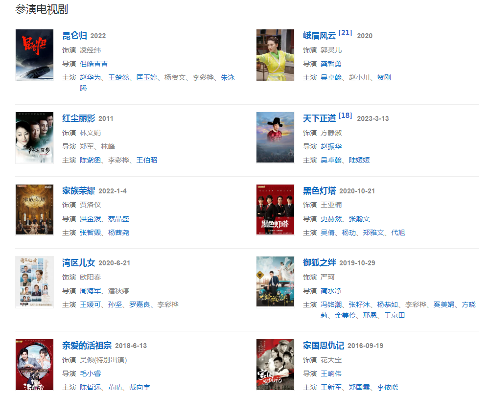 代表作品:昭君出塞、大旗英雄傳、大丫鬟、杜拉拉升職記、回家的誘惑