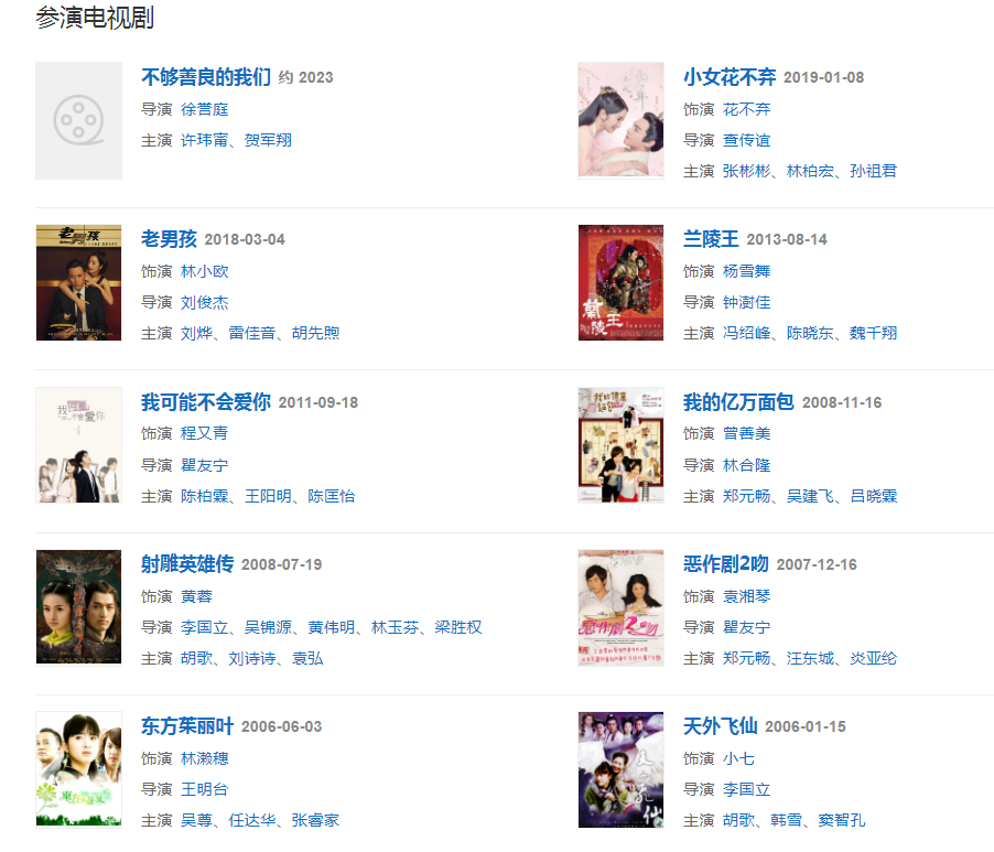 代表作品:惡作劇之吻、我可能不會(huì)愛(ài)你、天外飛仙、蘭陵王、射雕英雄傳、東方茱麗葉、老男孩、小女花不棄、孤單北半球、你、非你莫屬
