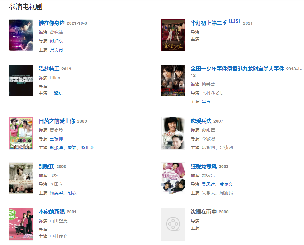 代表作品:狠狠愛、愛笑的眼睛、假扮的天使、我愛你x4、大麻煩、Vivi and...、不敗的戀人、笑林小子、星海、云水謠、非誠(chéng)勿擾、人魚朵朵、孤味、I'm V、偏愛你的心、戀愛兵法