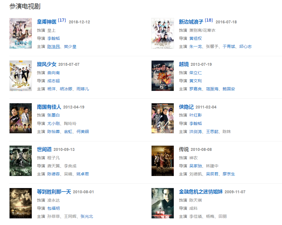 2005年,飾演古裝神話劇《寶蓮燈》中亦正亦邪的二郎神楊戩創(chuàng)下央視八套黃金時(shí)段9.1的收視紀(jì)錄。