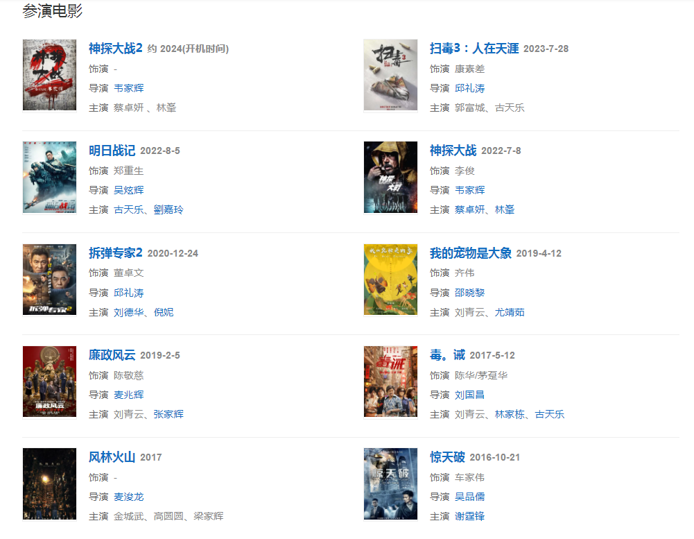 2017年5月12日,主演的犯罪動(dòng)作片《毒。誡》上映,片中飾演傳奇大佬茅躉華;同年,主演犯罪劇情片《風(fēng)林火山》,片中飾演一名警察。