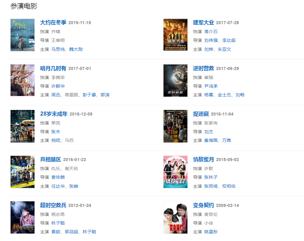 2019年,主演民國傳奇劇《筑夢情緣》 ;同年,主演愛情電影《大約在冬季》。